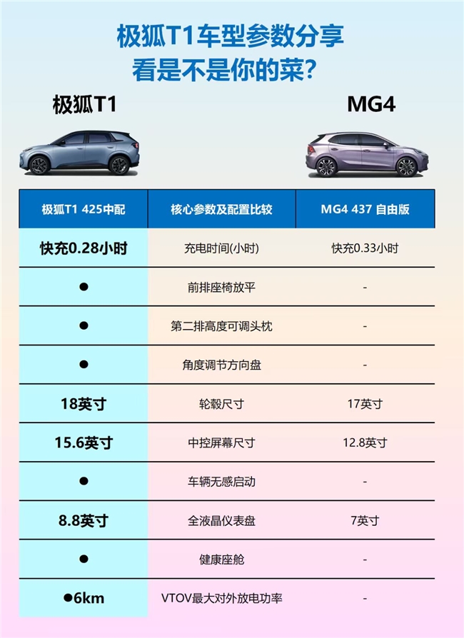 极狐T1此次预售共推出多个版本,其中入门版T1 320Plus预售价格6.88万元起,再加上其公布的配置来看,性价比极具竞争力。与MG4 437随心版相比,极狐T1在车身尺寸上虽略短,但在宽度、高度和轴距方面均占优,1860mm车宽、1572mm高度以及2770mm超长轴距,为车内带来更宽敞舒适的乘坐空间,尤其后排腿部与头部空间表现突出,甚至媲美部分B级车。